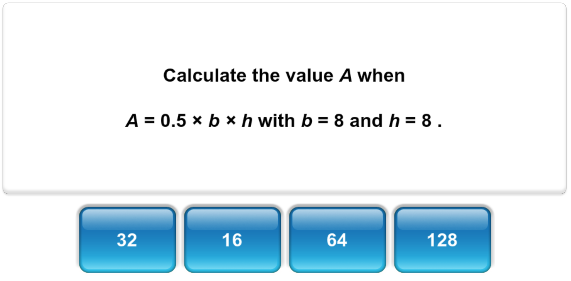Use the formula for the area of a rectangle to calculate the rectangle's area.